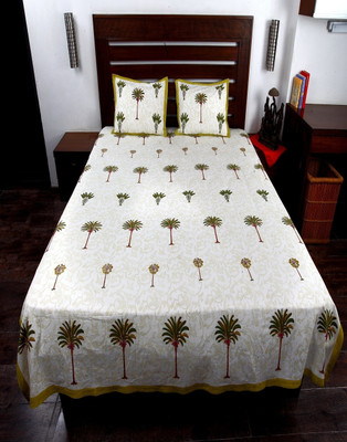Double bedsheet set in 100% cotton made up of one printed cotton bedsheet ?in white, green and brown with green border coconut tree print and 2 pillow covers.