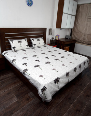 Double bedsheet set in 100 percent cotton made up of one printed cotton in white, dark green and brown with grey border coconut tree print.it comes with 2 matching pillow covers in same design.