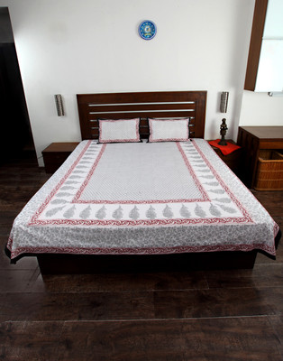 Double bedsheet set in 100 percent cotton made up of one printed cotton in white, maroon and black with black border.it comes with 2 matching pillow covers in same design.
