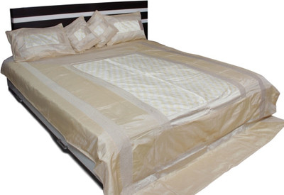 It is a beautiful double bed size bed cover 5 piece set including : 1 bed cover90x108 inches,2 cushion covers16x16 inches and 2 pillow coversstandard size.It is made on polysilk fabric.