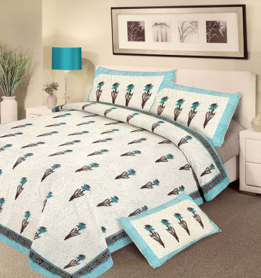 Richly textured block print pattern pure cotton double bed sheet; Features a blossom motif in blue and brown against a subtle, yet distinctive offwhite background; This Double Bed sheet Comes with two matching pillow covers; Block print done on 100% pure cotton; Ideal for King size beds of size 72 * 77 inches; Sheet Size - X * X inches & pillow cover size - X * X inches