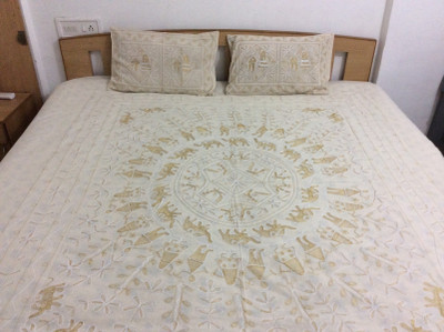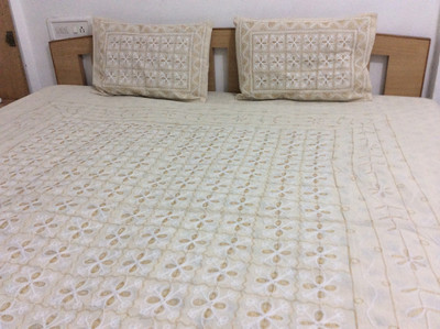 Double Bed Sheet With Two Pillow Cover, crafted with beautiful AARI Work. Cotton Off-White Bed Sheet with Golden AARI craft Work makes it very Elegant & Premium.