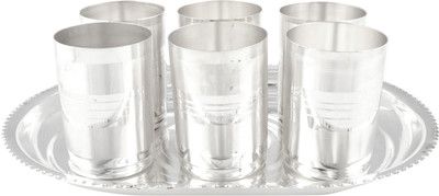 Beautiful silver plated Mayuri Glass set with tray. This set is made using highly pure stainless steel, which is coated with silver polish. A must have accessory for your dining table. Exclusive utility item to serve your guest in style. A classy gift item for all occasions Disclaimer: Product colour may slightly vary due to photographic lighting sources or your monitor settings. Note: No Warranty for Silver Coating.