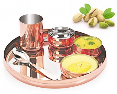 Complete with a plate, two Vati bowls, a Rasmalai bowl, a spoon, and a glass, this set comes in a burnished copper finish that will make your traditional thali meal taste even more delicious.