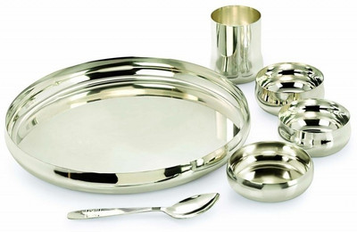 GURUKRUPA is inspired by today's Lifestyle and Needs. We at GURUKRUPA design and manufacture our products keeping in mind customer?s taste and need. Our products are made from Premium quality Steel and assure Durability. Our products are elegant as far as designs are concerned and will decorate your Kitchen and Dinner Table more. Our motto is to meet your requirement in the most efficient manner and your satisfaction will be our reward. We are committed to deliver best products for your needs. We are sure to serve you again once you try our products.CONTAINS-1 THALI,1 RASMALAI,2 VATI,1 SPOON,1 GLASS