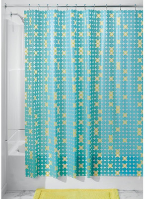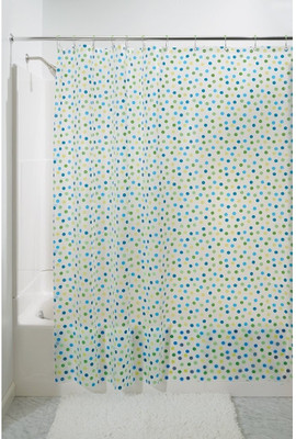 Decorate your bathroom with the dotz shower curtain from interdesign. Multi - colored dots cover the face of this 100 - percent peva curtain. 70 - by 71 - inch size fits standard width showers. Top lined with 12 grommets for hanging. Includes 12 metal roller rings with tinted lime balls for hanging. No liner required with this 100 - percent waterproof curtain.