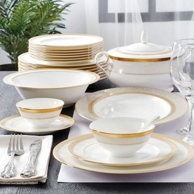 When easy elegance is the call of the evening, the Portland Gold Dinner Set of 61 pieces makes for a splendid pick. This elaborate white porcelain dinner set comes adorned by a patterned beige border and golden rims for a resplendent touch to any table setting. Versatile enough to help serve a range of cuisines, this dishwasher safe dinner set has been crafted to bring you lasting convenience. 8 Dinner Plate 8 Half Plate 8 Dessert Plate 16 Vegetable Bowl 8 Soup Bowl 8 Soup Spoon 2 Serving Bowl 1 Oval Platter 1 Casserole