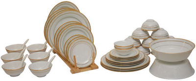 Marking your meals with the delicacy of fine porcelain, adorned by sublime floral patterns and lustrous golden bands, the Brunswick Gold Dinner Set of 45 pieces has been crafted to charm. Whether it???s a regular meal or celebratory feast, this charming dinner set puts a refreshing spin on everything your serve with its inspiring use of white and gold. Made dishwasher safe, you can savor those delights at leisure without stressing over tedious cleaning. 6 Dinner Plate 6 Half Plate 6 Dessert Plate 12 Vegetable Bowl 6 Soup Bowl 6 Soup Spoon 2 Serving Bowl 1 Oval Plate- 14 Inch