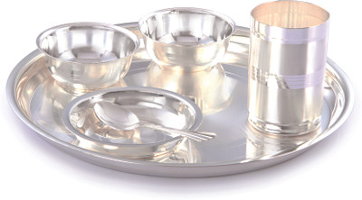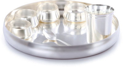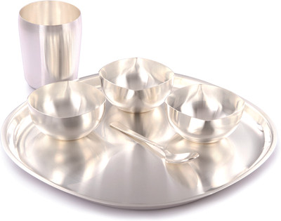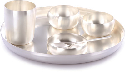 This Matt finish Silver Plated Dinner Set comprises of plate, sweet dish, 2 bowls, glass and spoon. Serve the food in this traditional silver plated Dinner set or gift to your close one's.