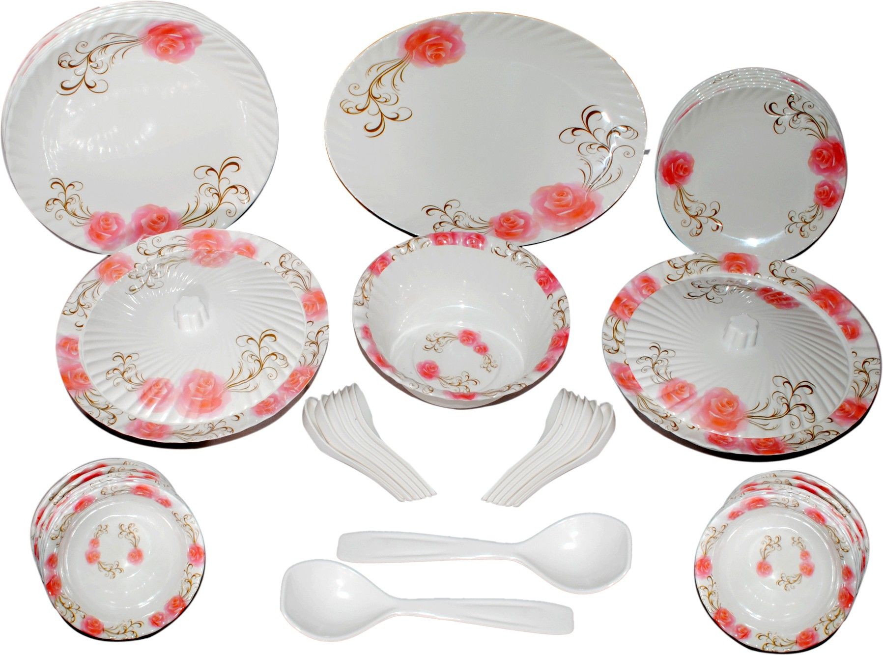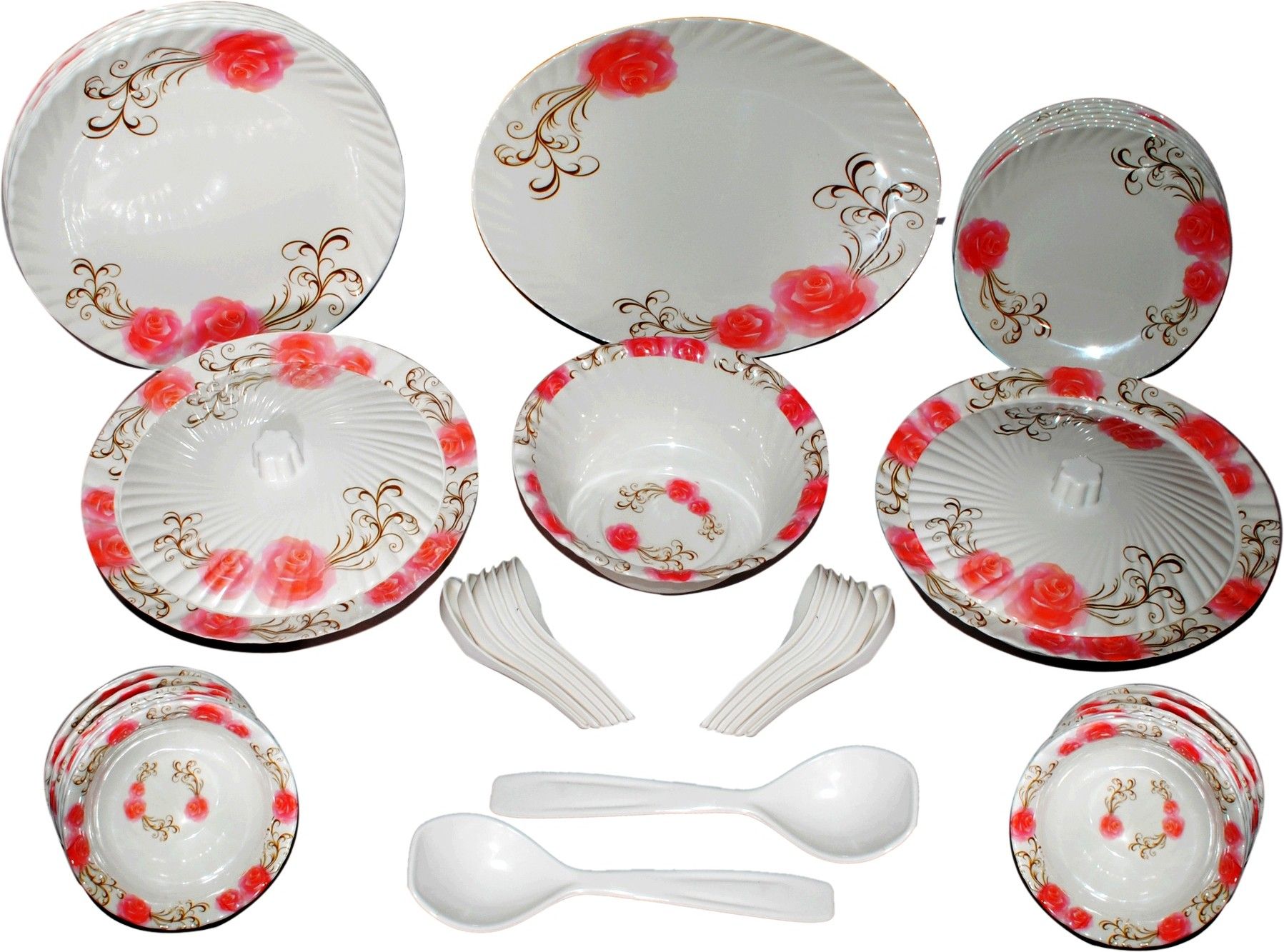Melamine dinner set containing 44 pcs :- 6 full plates 6 half plates 12 veg bowls 1 rice plate 2 donga base 2 donga lids 1 open donga 2 service spoons 12 soup spoons