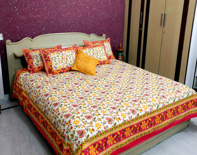 Snehkriti's 100% Pure Cotton Double Bedsheet in Jaipuri Gold Print Floral design is one of its kind product. Fast Color, Comfort feel, Pure Cotton, Traditional design are its best features. Adding a new look to your interior, this bedsheet with pillow covers set is worth buying.
