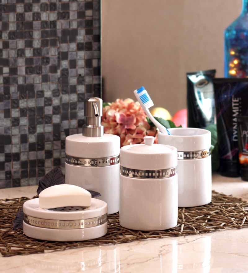 Here is a set of Foyer Bathe set ready to grace your beautiful bathroom and your needs for washing, cleansing and bathing. The fine finished high quality ceramic set combines an elegant liquid soap dispenser, cotton bowl, jar, dish and a tumbler to make your day to day bathing refreshing with all the essentials. Foyer is renowned for creating aesthetically refined and luxurious essentials for sanitary needs in modern homes. A one-stop shop for home décor and furniture, Pepperfry sells a home product every 30 seconds.