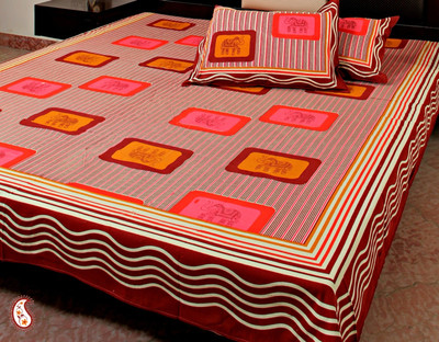 Classic, versatile styling comes together in this Burnt Orange, Pink, Maroon and Yellow Pure Cotton Jaipuri print Bed Spread. Featuring Block of Colour with Motifs of the Royal Elephants this Bed Spread will bring an understated elegance to your bedroom's decor. The bed sheet comes with fast colours and guaranteed original designs and prints.; Size of double bed sheet is - 90*108 inches 7.5 ft. * 9 ft. ; This is the gross size and size after shrinkage and edge stitching is - 88* 104 inches ; Bed sheet set comes with set of 02 matching Pillow covers of size 16*25 inches ; Fabric is 100% prewashed Cotton ;Wash care Instruction : Normal Hand wash in cold water, Dry in shade. ; Brand Aapno Rajasthan.