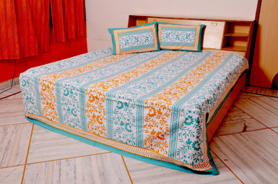 Furry Rajasthani Sanganeri Floral Print Multicolor Cotton Double Bedsheet With 2 Pillow Cover
