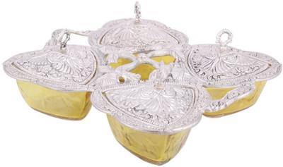 White metal flora carved 4 attched bowls with lid for dry friuts,sweets,cookies etc