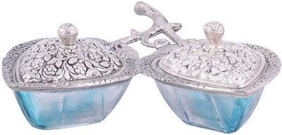 White metal flora carved 2 attched bowls with lid for dry friuts,sweets,cookies etc